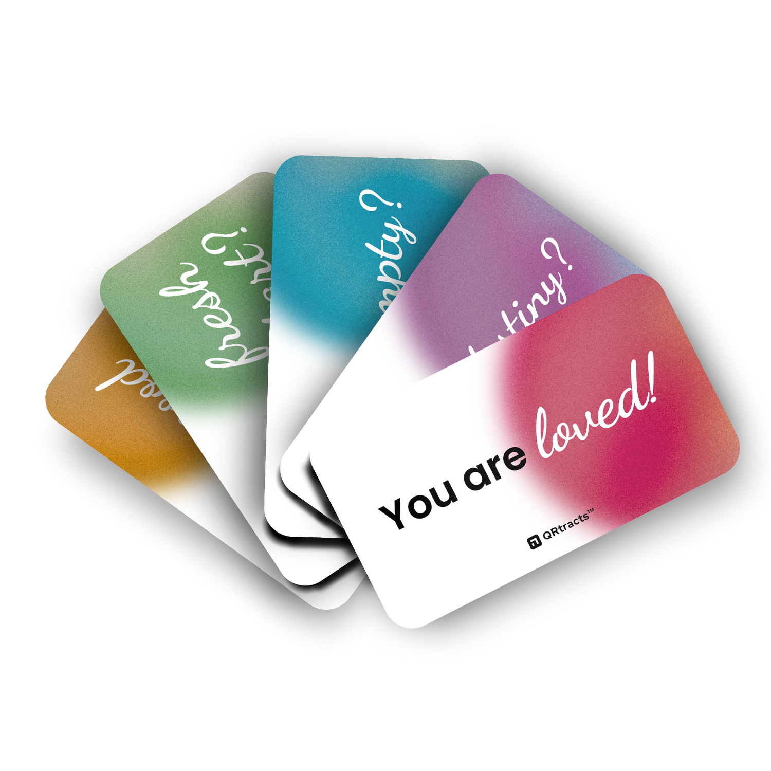 A QRtract is a double-sided 2" x 3.5" card featuring an attention-grabber, several questions, and a QR code that leads someone to a Gospel message on their smartphone.