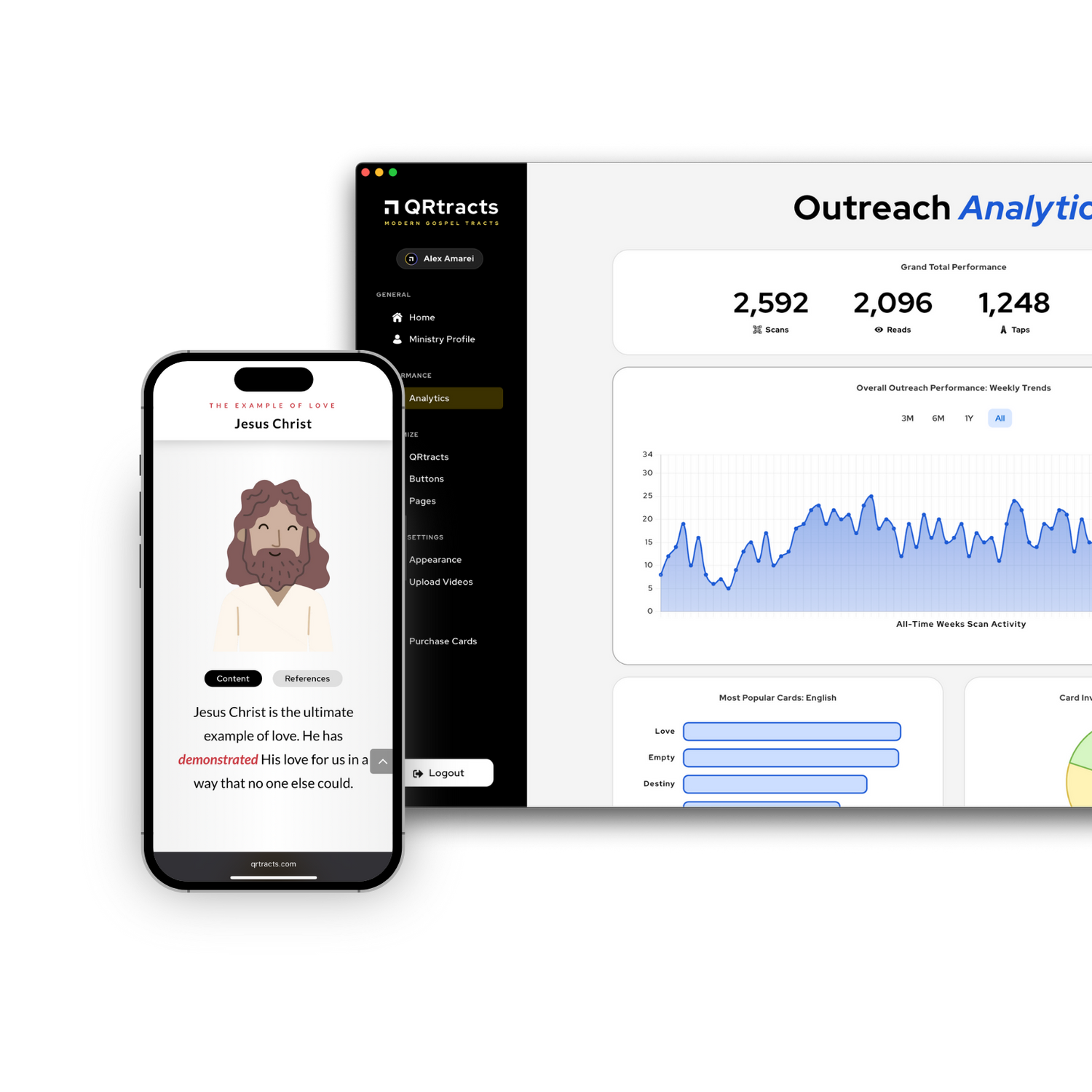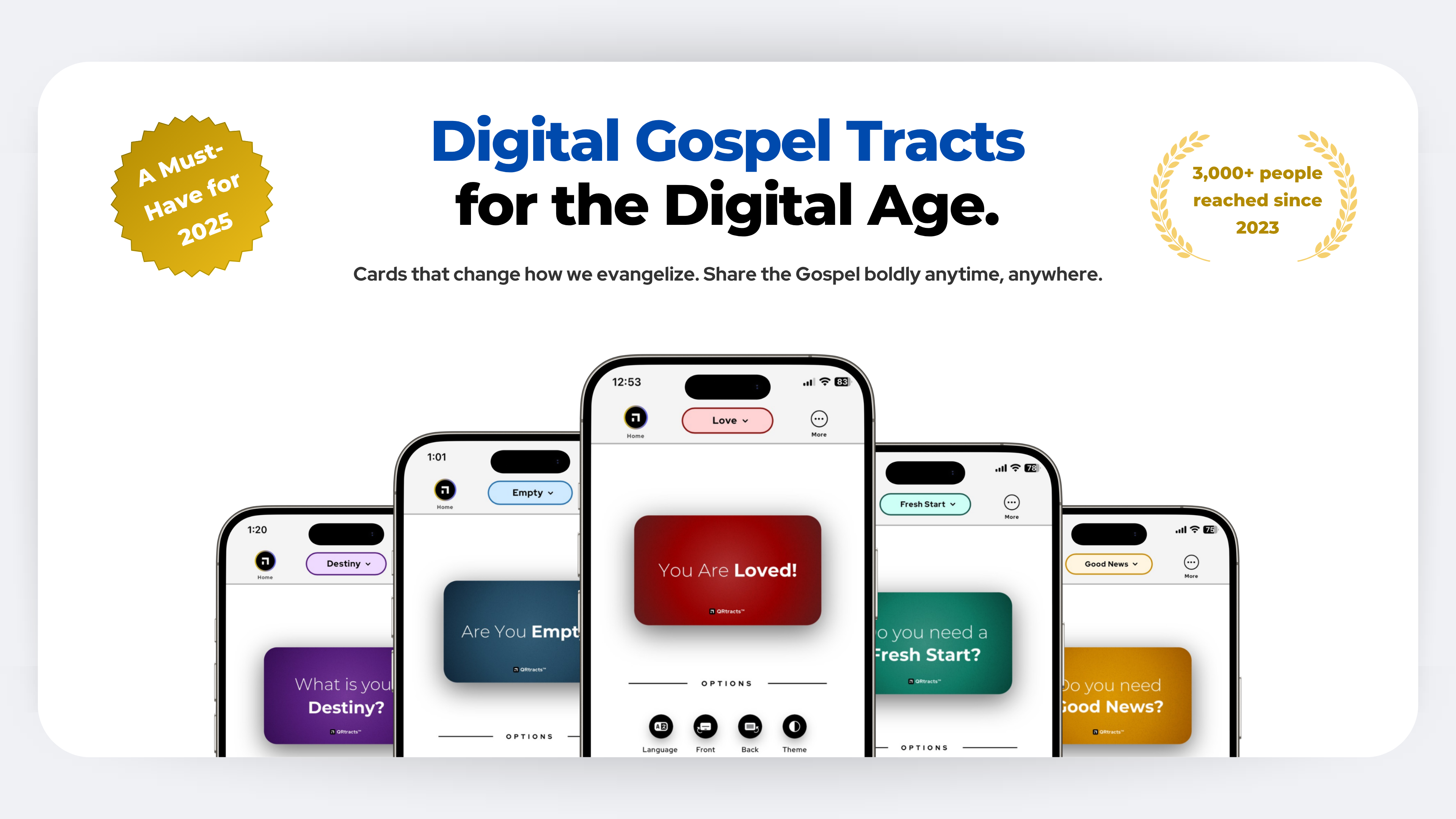 It is simple yet powerful! We provide physical business card-sized gospel tracts that you can hand out like traditional tracts, but with a modern twist. Each card features a QR code, which, when scanned, presents the gospel message on a smartphone in an engaging, scrolling experience with dynamic text, animations, images, and more!