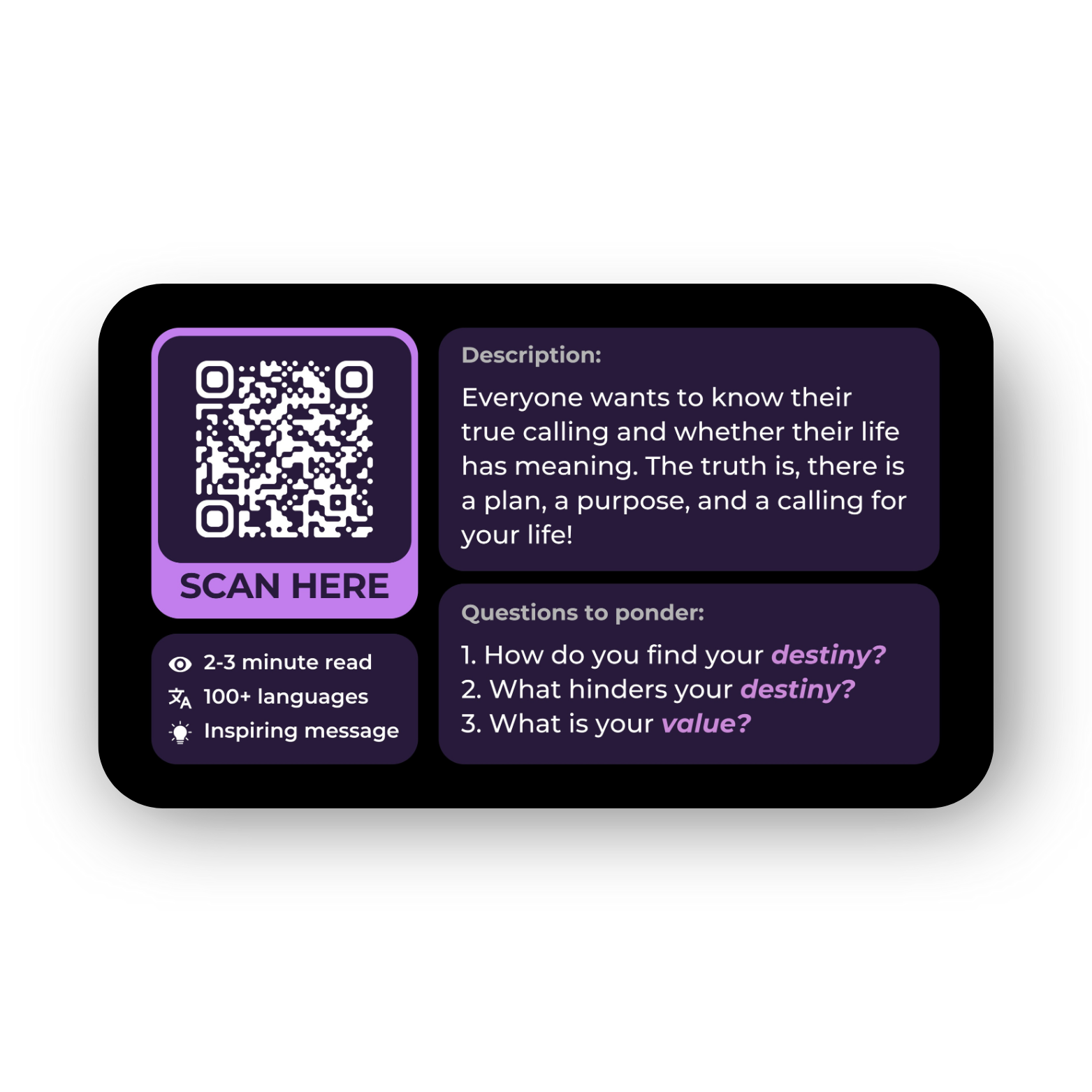 Everyone wants to know their value and purpose in life. Society bombards us with various methods to be in control of our lives, often steering us away from our God-given passions. God has created a wonderful plan for each of our lives, blessing us with natural born gifts and talents to bring glory to His name and maximize our potential. Tell others about God’s plan for their life with this QRtract™!